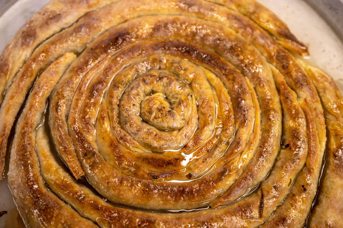 6. Rulo halindeki yufkalar iki uçtan büzülerek kıvırılır ve yağlanmış tepsiye dizilir.