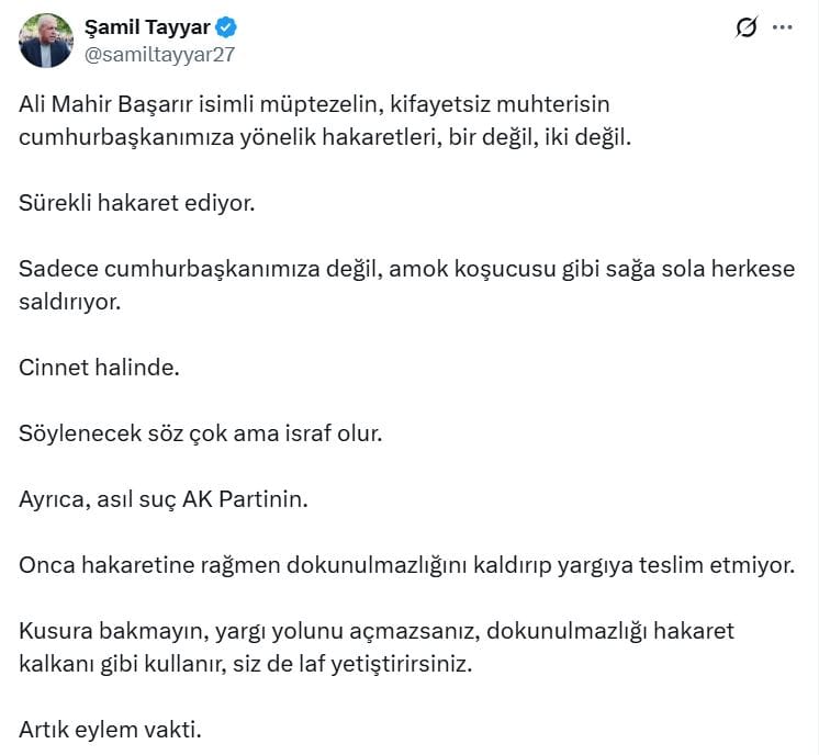 "Ali Mahir Başarır isimli müptezelin, kifayetsiz muhterisin cumhurbaşkanımıza yönelik hakaretleri, bir değil, iki değil. Sürekli hakaret ediyor. Sadece cumhurbaşkanımıza değil, amok koşucusu gibi sağa sola herkese saldırıyor. Cinnet halinde. Söylenecek söz çok ama israf olur.""Ayrıca, asıl suç AK Partinin. Onca hakaretine rağmen dokunulmazlığını kaldırıp yargıya teslim etmiyor. Kusura bakmayın, yargı yolunu açmazsanız, dokunulmazlığı hakaret kalkanı gibi kullanır, siz de laf yetiştirirsiniz. Artık eylem vakti."