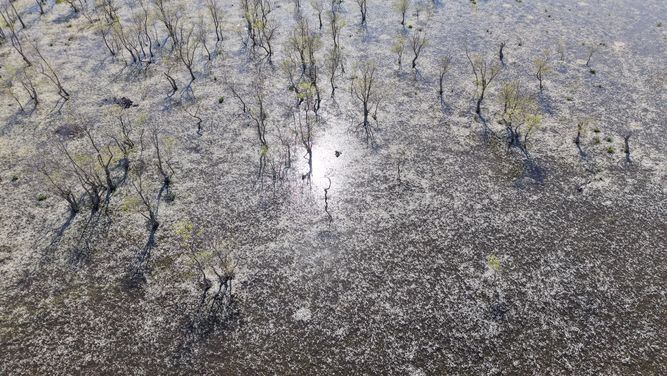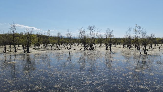 Kızılırmak Deltası'nın Alaçam sınırlarındaki ormanlık mera alanı, baharın gelişiyle birlikte eşsiz bir doğa manzarasına ev sahipliği yapıyor.