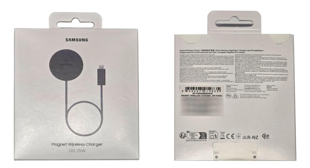 Şarj cihazının bir ucunda USB Type-C girişi, diğer ucunda ise dairesel manyetik kablosuz şarj diski bulunuyor. Kablo, naylon örgülü bir yapıya sahip görünüyor. Samsung, bu cihazın 45W'lık bir USB Power Delivery şarj adaptörü ile eşleştirilmesini öneriyor. Tasarım olarak Apple da dahil olmak üzere diğer markaların Qi2 kablosuz şarj disklerine oldukça benziyor.