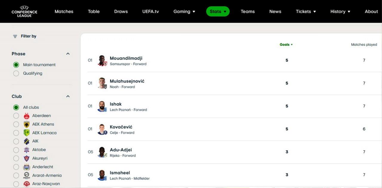 Mouandilmadji ile birlikte aynı gol sayısına sahip olan Noah oyuncusu Nardin Mulahusejnovi, Lech Poznan oyuncusu Mikael Ishak ve Ferencvros oyuncusu Franko Kovaevi de 5 golle Mouandilmadji'nin krallığına ortak oldu.