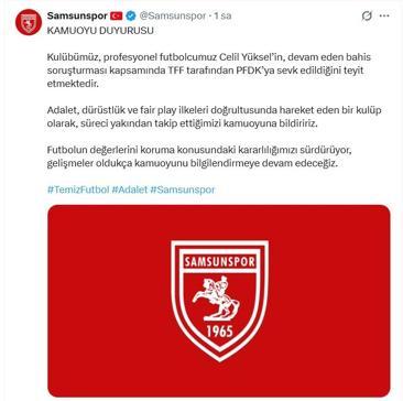 Samsunspor, sosyal medyadan yaptığı açıklamada, "Kulübümüz, profesyonel futbolcumuz Celil Yüksel’in, devam eden bahis soruşturması kapsamında TFF tarafından PFDK’ya sevk edildiğini teyit etmektedir. Adalet, dürüstlük ve fair-play ilkeleri doğrultusunda hareket eden bir kulüp olarak, süreci yakından takip ettiğimizi kamuoyuna bildiririz. Futbolun değerlerini koruma konusundaki kararlılığımızı sürdürüyor, gelişmeler oldukça kamuoyunu bilgilendirmeye devam edeceğiz" denildi.