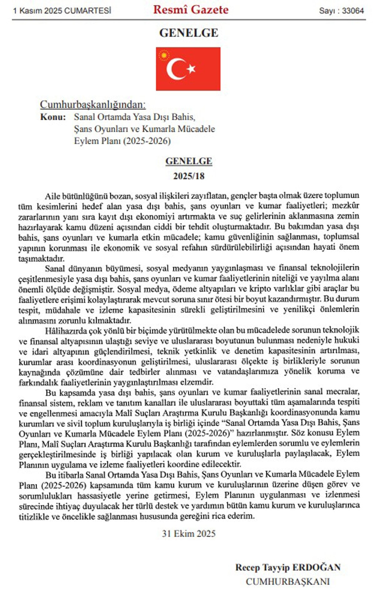 Genelgede, sanal dünyanın gelişimi ve finansal teknolojilerin yaygınlaşmasıyla bu faaliyetlerin sınır ötesi bir nitelik kazandığına dikkat çekilerek; mücadelede tespit, müdahale ve izleme kapasitesinin güçlendirilmesi gerektiği belirtildi. Bu kapsamda, yasa dışı bahis ve kumar faaliyetlerinin sanal mecralar, finansal sistem, reklam ve tanıtım kanalları ile uluslararası boyuttaki tüm aşamalarında tespiti ve engellenmesi amacıyla, Mali Suçları Araştırma Kurulu (MASAK) koordinasyonunda kamu kurumları ve sivil toplum kuruluşlarının katılımıyla 'Sanal Ortamda Yasa Dışı Bahis, Şans Oyunları ve Kumarla Mücadele Eylem Planı (2025-2026)' hazırlandı.