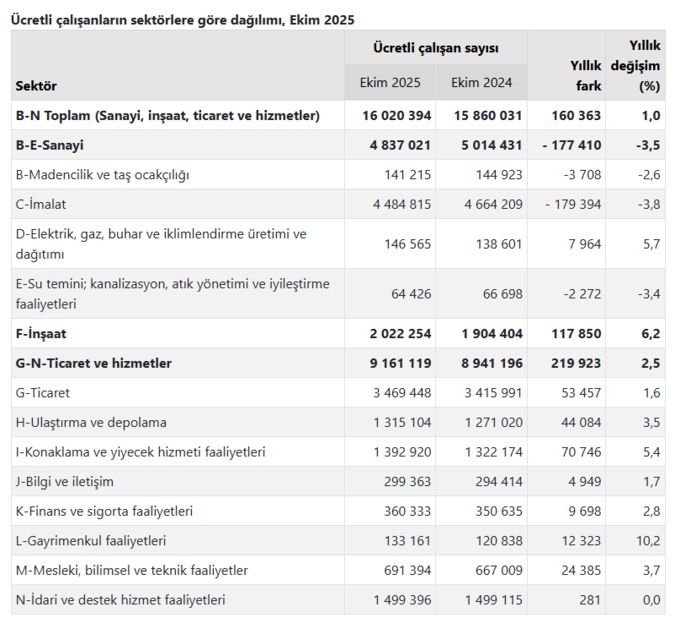Türkiye İstatistik Kurumunun (TÜİK) verilerine göre, ekim ayında ücretli çalışan sayısı geçen yılın aynı ayına göre yüzde 1 oranında arttı.
