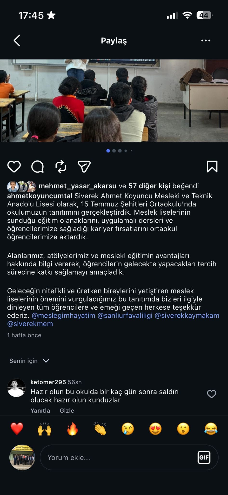 Saldırganın, "Hazır olun bu okulda birkaç gün sonra saldırı olacak" "hepinizi yok edeceğim" şeklinde tehdit yorumları paylaştığı görüldü.