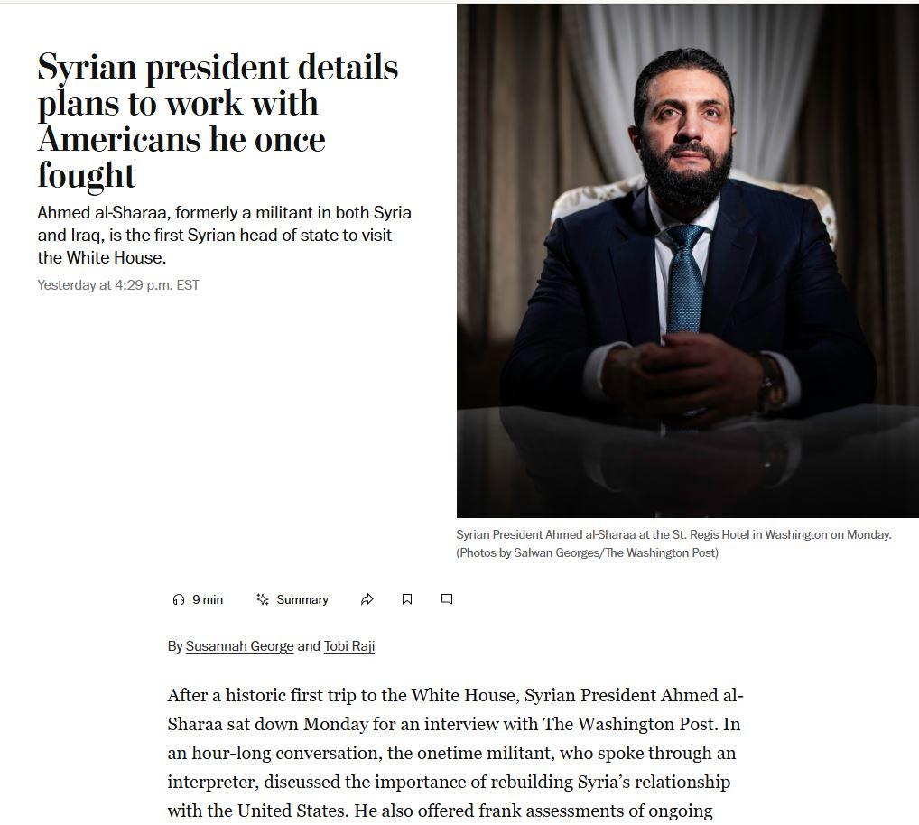 11 Kasım 2025 günü The Washington Post'ta yayınlanan röportajda, Ahmed Şara, Trump hükümetiyle ilişkilere ve Suriye'nin yeniden inşasına dair değerlendirmelerde bulundu.