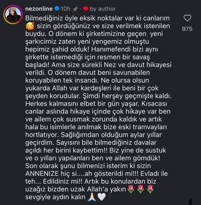 ''Bilmediğiniz öyle eksik noktalar var ki canlarım... Sizin gördüğünüz ve size verilmek istenilen buydu. O dönem ki şirketimize geçen yeni şarkıcımız zaten yeni yengemiz olmuştu hepimiz şahit olduk! Hanımefendi bizi aynı şirkette istemediği için resmen bir savaş başladı! Ama size sürekli Nez ve Davut hikayesi verildi. O dönem Davut beni savunabilen, koruyabilen tek insandı. Ne olursa olsun yukarıda Allah var, kardeşleri ile beni birçok şeyden korudular.