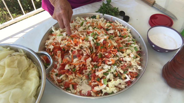 İç harç hazırlanırken, beyaz lahananın yaprakları kaynar suda bekletilip soğuk suyla şoklanarak sarılmaya uygun hale getiriliyor. Suyunu salan iç harç, avuçta sıkılarak fazla suyundan arındırılıyor ve kare kesilmiş lahana yapraklarına sıkıca sarılıyor.