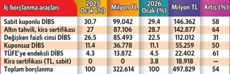 İç borçlanmada dikkat çekici artış ise son dönemin en riskli yatırım araçları arasında yer alan altınla yapılan borçlanmada görüldü. Ocak ayındaki 497.8 milyar liralık iç borçlanmanın yüzde 28.7’si altın tahvili ve altın kira sertifikası ihraç edilerek gerçekleştirildi. Bu da Hazine’nin yaklaşık 143 milyar lira yeni altın borçlanması yaptığı anlamına geliyor. Geçen yılın ocak ayında bu oran yüzde 27 olmuştu. Altınla yapılan borçlanma tutarı geçen yılın aynı ayına göre yüzde 64 oranında devasa düzeyde arttı. Buna karşılık en risksiz borçlanma enstrümanı olan sabit kuponlu devlet iç borçlanma senetleriyle (DİBS) yapılan borçlanma oranı geçen yıla göre 1.3 puan azalarak yüzde 29.4’e (146.4 milyar TL) geriledi.