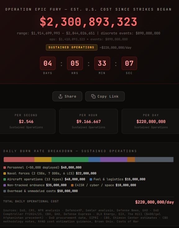 Küresel kamuoyunun hizmetine sunulan "iran-cost-ticker" adlı platform, savaşın faturasını tahmini bir veri modelleme yöntemiyle dijital ekrana yansıtıyor. Sitede yer alan verilere göre, saldırıların başladığı ilk günden bu yana genel maliyet 4 günde 2 milyar 300 milyon 893 bin 323 dolara aştı.