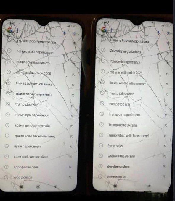 Paylaşılan görüntüde ekranı büyük ölçüde çatlamış telefonlarda, askerin arama geçmişi açık şekilde görülüyor. Aramaların büyük bölümünü Ukrayna-Rusya müzakereleri, Zelenskiy'nin görüşmeleri, Trump'ın savaşı durdurup durduramayacağı, Putin'in temasları, ABD'nin Ukrayna'ya yardımı ve savaşın 2025'te ya da yaz aylarında bitip bitmeyeceğine dair başlıklar oluşturuyor.
