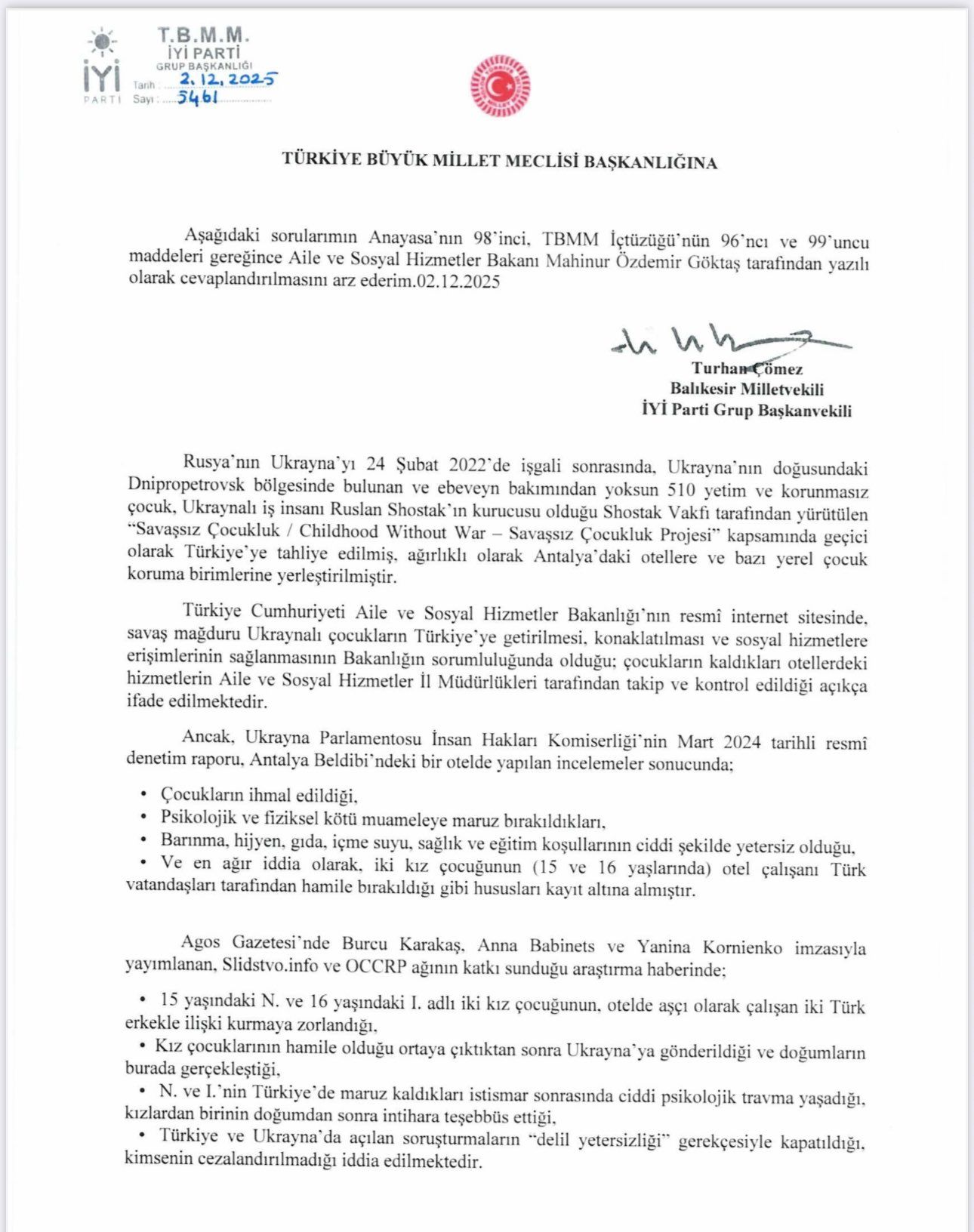 BAKANLIĞA SORDUİki kız çocuğu otel çalışanları tarafından hamile bırakıldı. Konuyu Meclis gündemine taşındı. İYİ Parti Grup Başkanvekili Turhan Çömez, TBMM'ye Aile ve Sosyal Hizmetler Bakanı Mahinur Özdemir tarafından cevaplanması üzerine soru önergesi verdi.