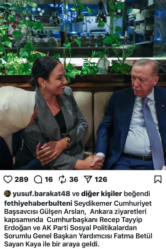Seydikemer Cumhuriyet Başsavcısı Gülşen Arslan, AKP'li Fatma Betül Sayan Kaya ile AKP'li Cumhurbaşkanı Recep Tayyip Erdoğan'ı ziyaret etti. Söz konusu ziyarete CHP Şanlıurfa Milletvekili Mahmut Tanal sert tepki gösterdi.