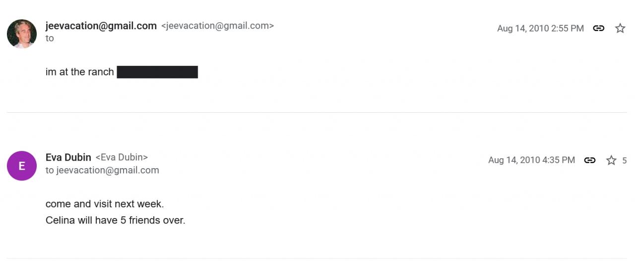 Eva Andersson-Dubin ile Jeffrey Epstein arasında 13-14 Ağustos 2010 tarihlerinde gerçekleşen mail trafiğinde şu ifadeler yer aldı: