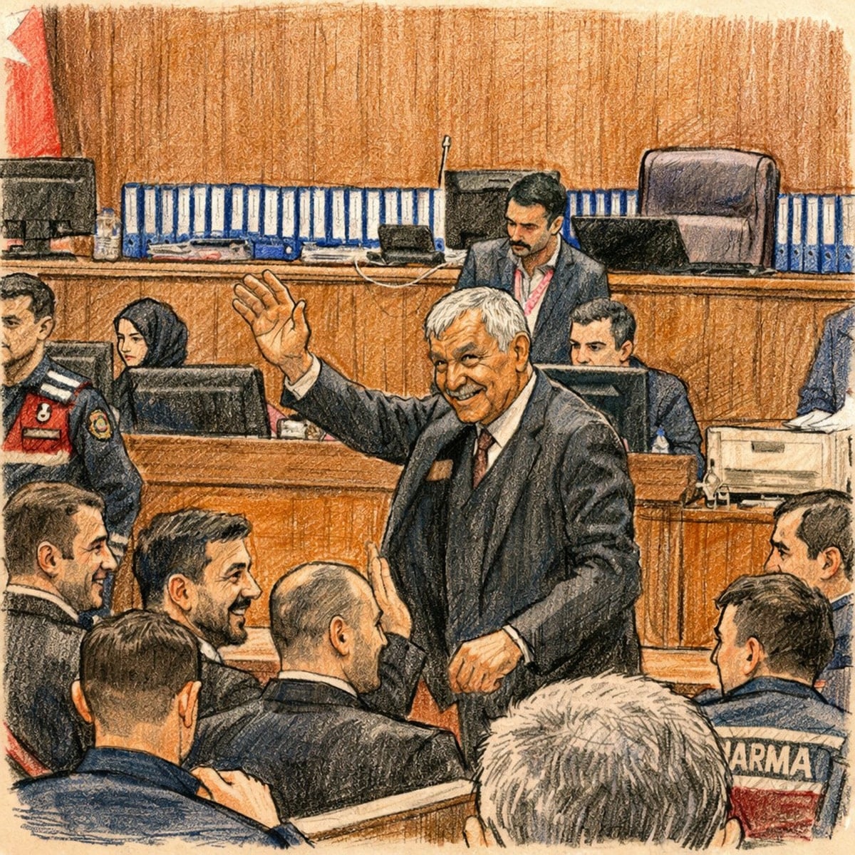 Verdiği ifadelerle CHP’li başkanları tutuklatan Aziz İnsan Aktaş, duruşma salonuna 15 kişilik koruma ordusuyla geldi. Tutuksuz yargılanan Aktaş, “Adalet mülkün temelidir. İlk gün söylediğim gibi, kaçmadım buradayım. Söylediklerimi tekrarlayacağım” dedi.