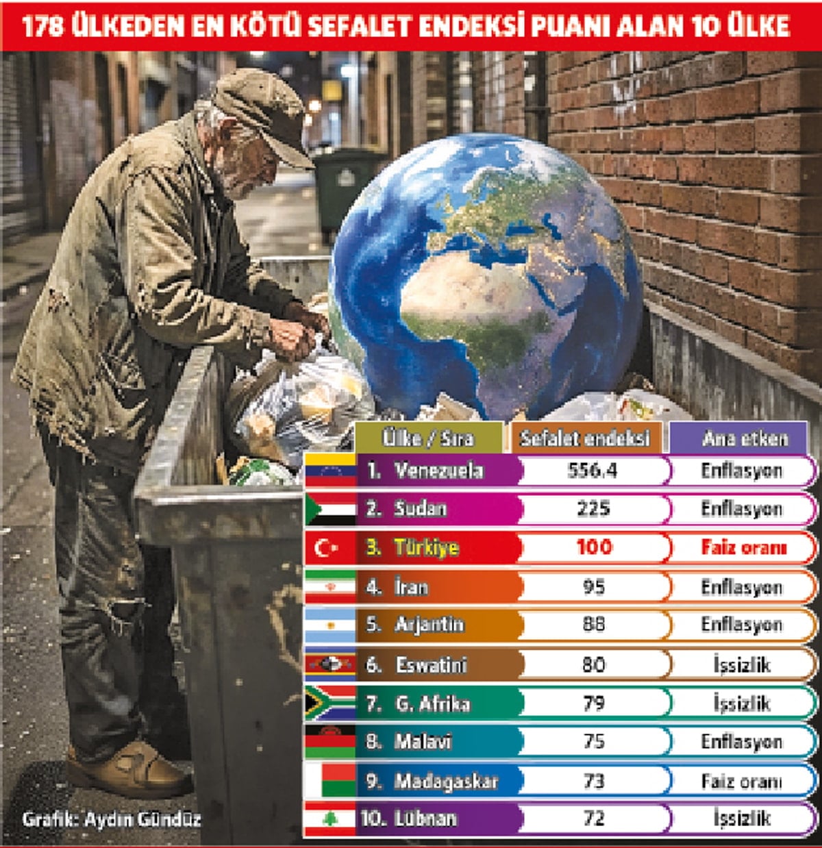 Prof. Hanke, 178 ülkenin yer aldığı listede Venezuela, Sudan, Türkiye, İran, Arjantin, Svaziland (Eswatini), Güney Afrika, Malavi, Madagaskar ve Lübnan’ın ilk 10’a yerleştiğini belirledi. Venezuela, 556.5’lik HAMI puanıyla bu yıl dünyanın en sefil ülkesi olarak zirveye yerleşti.