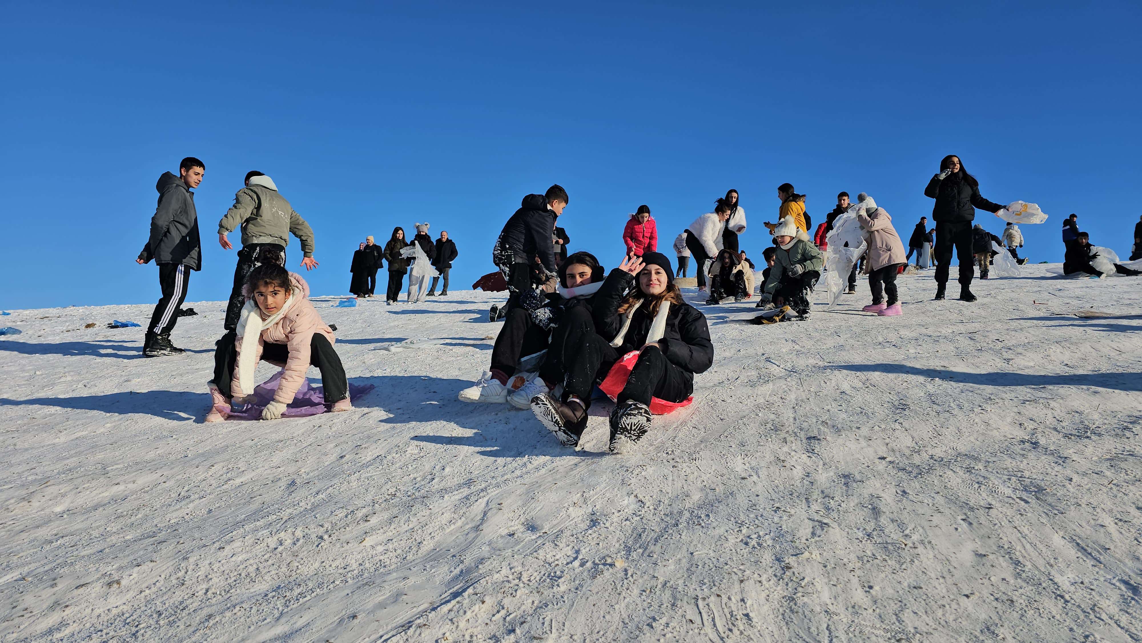 Kar yağışıyla beyaza bürünen tepe, hem çocukların hem de ailelerin eğlence noktası oldu.