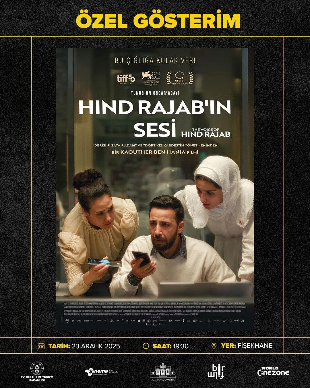 İstanbul’da Kültür ve Turizm Bakanlığı Sinema Genel Müdürlüğü, İstanbul Valiliği ve Sinema Salonu Yatırımcıları Derneği iş birliği ile Gazze’yi konu alan "Hind Receb’in Sesi" filminin özel gösterimi gerçekleştirildi. İstanbul Zeytinburnu ilçesi Fişekhane’de düzenlenen programa İstanbul Valisi Davut Gül, Gazzeli Hind Receb'in aile fertleri, iş insanları ve birçok davetli katıldı.