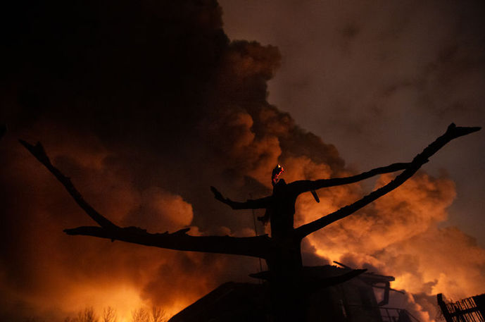 Petrol deposunda saldırı sonrası çıkan yangın devam ederken, bölgede bulunan çok sayıda tanker ve araç kullanılamaz hale geldi.