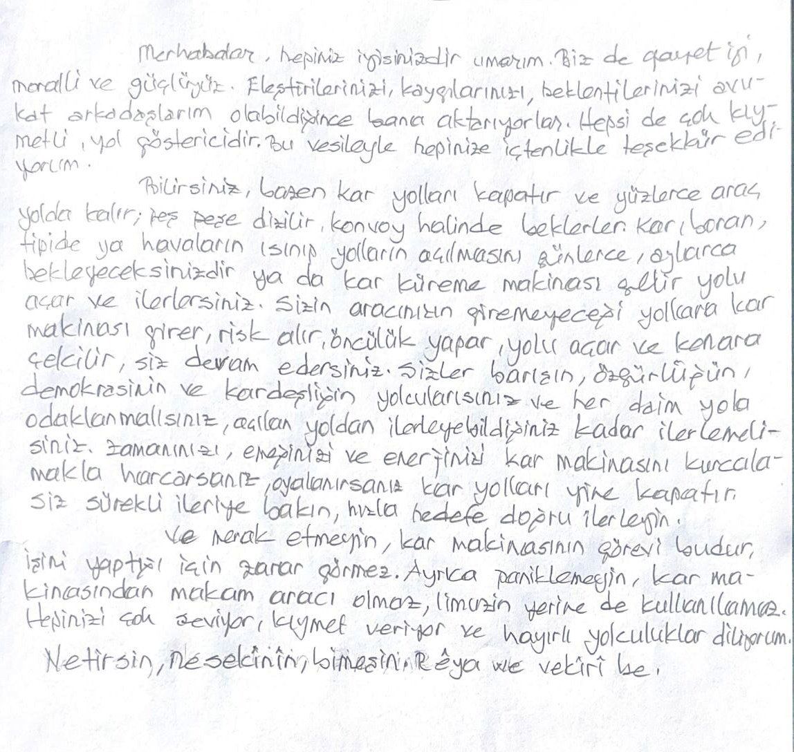 Bilirsiniz, bazen kar yolları kapatır ve yüzlerce araç yolda kalır; peş peşe dizilir, konvoy halinde beklerler. Kar, boran, tipide ya havaların ısınıp yolların açılmasını günlerce, aylarca bekleyeceksinizdir ya da kar küreme makinası gelir yolu açar ve ilerlersiniz. Sizin aracınızın giremeyeceği yollara kar makinası girer, risk alır, öncelük yapar, yolu açar ve kenara çekilir, siz devam edersiniz. Sizler barışın, özgürlüğün demokrasinin ve kardeşliğin yolcularısınız ve her daim yola odaklanmalısınız, açılan yoldan ilerleyebildiğiniz kadar ilerlemelisiniz. Zamanızı, emeğinizi ve enerjinizi kar makinasını kurcalamakla harcarsanız oyalanırsanız kar yolları yine kapatır. Siz sürekli ileriye bakın, hızla hedefe doğru ilerleyin.