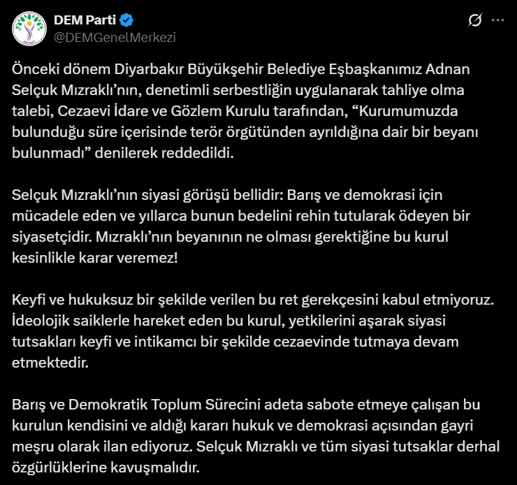 "Önceki dönem Diyarbakır Büyükşehir Belediye Eşbaşkanımız Adnan Selçuk Mızraklı’nın, denetimli serbestliğin uygulanarak tahliye olma talebi, Cezaevi İdare ve Gözlem Kurulu tarafından, “Kurumumuzda bulunduğu süre içerisinde terör örgütünden ayrıldığına dair bir beyanı bulunmadı” denilerek reddedildi.
