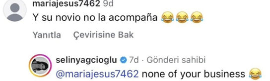 Selin Yağcıoğlu’nun paylaşımlarının altına bir kullanıcı İspanyolca "Sevgilisi neden yanında değil?" şeklinde yorumda bulundu. Yoruma kayıtsız kalmayan Yağcıoğlu, yine İspanyolca yanıt vererek; "Seni alakadar etmez" yazdı.