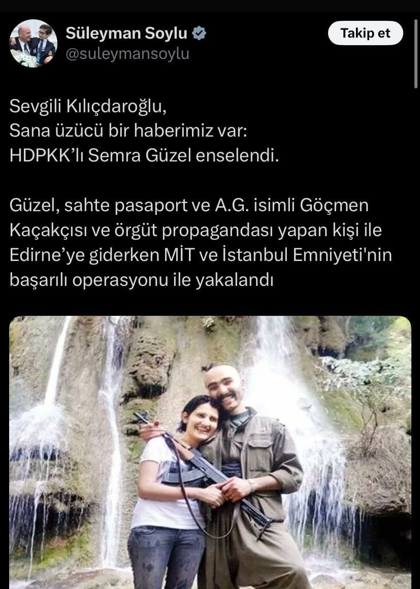 SOYLU'NUN PAYLAŞIMI YENİDEN GÜNDEM OLDUGüzel’in tahliyesi sonrası, dönemin İçişleri Bakanı Süleyman Soylu’nun 2022 yılında yaptığı paylaşım sosyal medyada yeniden gündem oldu. Soylu, o dönemde Güzel’in fotoğrafını paylaşarak, “Sevgili Kılıçdaroğlu, sana üzücü bir haberimiz var: HDPKK’lı Semra Güzel enselendi” ifadelerini kullanmıştı.