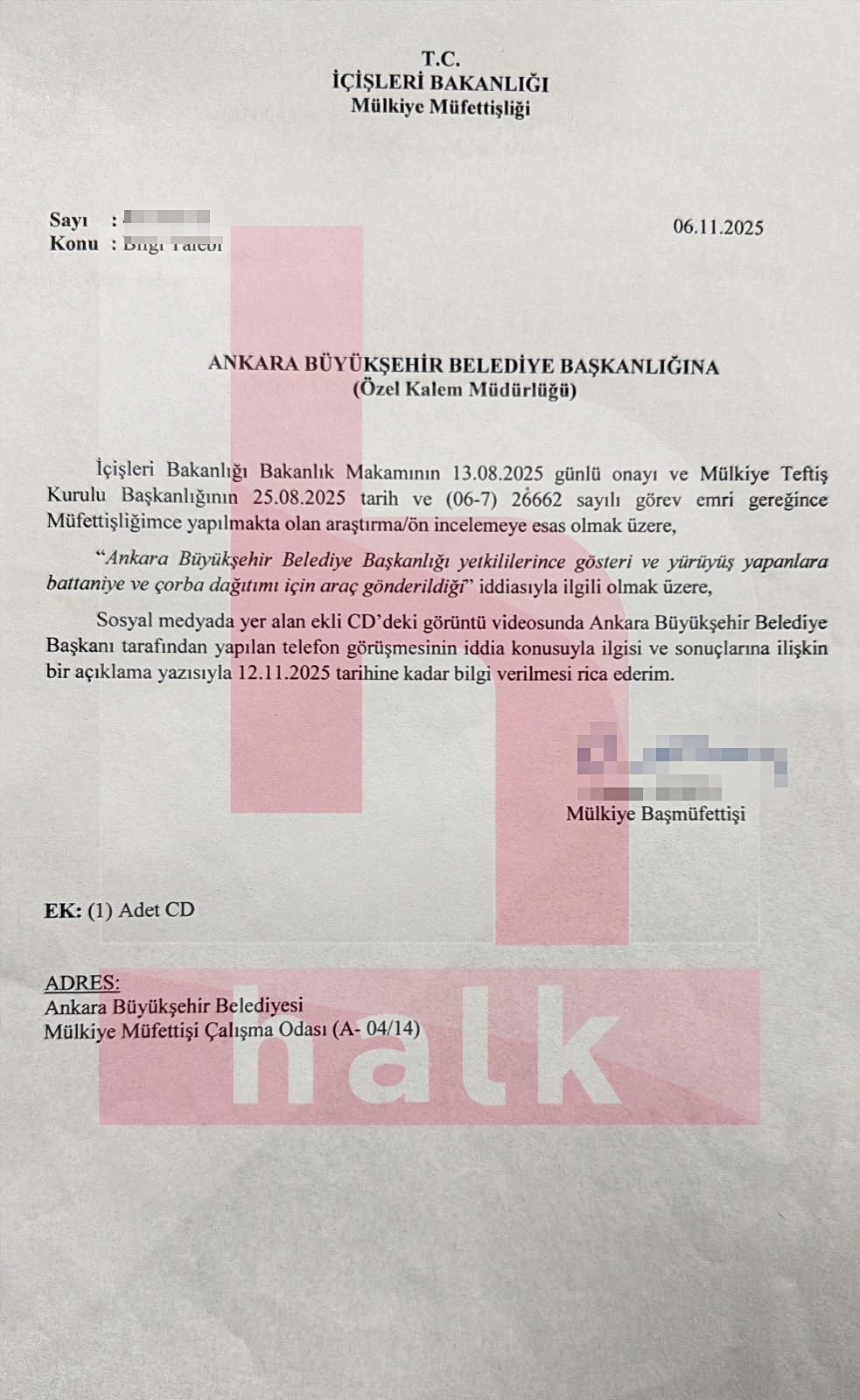 Söz konusu belgede, "Ankara Büyükşehir Belediye Başkanlığı yetkililerince gösteri ve yürüyüş yapanlara battaniye ve çorba dağıtımı için araç gönderildiği iddiasıyla ilgili olmak üzere, Sosyal medyada yer alan ekli CD'deki görüntü videosunda Ankara Büyükşehir Belediye Başkanı tarafından yapılan telefon görüşmesinin iddia konusuyla ilgisi ve sonuçlarına ilişkin bir açıklama yazısıyla 12.11.2025 tarihine kadar bilgi verilmesi rica ederim" ifadelerine yer verildi.