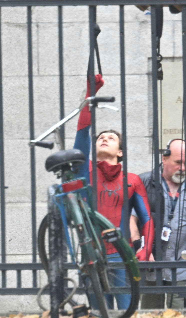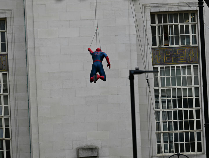 Tom Holland, önümüzdeki temmuz ayında vizyona girmesi planlanan Marvel filminin çekimleri sırasında, bir kayışla yüksekten sarkarken görüldü.