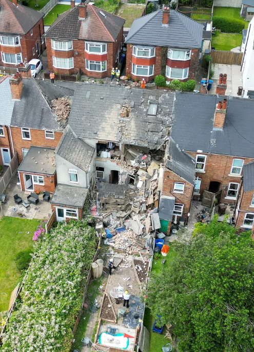 Derbyshire Polisi tarafından yayımlanan görüntülerde, patlamanın etkisiyle evin ön cephesinin sokağa ve yoldan geçen bir aracın üzerine doğru savrulduğu anlar yer aldı.