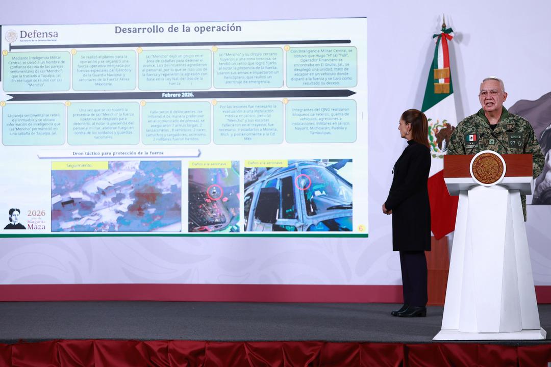 Meksika'da öldürülen Jalisco Yeni Nesil Karteli (CJNG) lideri "El Mencho" lakaplı Nemesio Oseguera'nın ardından ülke genelinde karışıklık devam ederken, Meksika Devlet Başkanı Claudia Sheinbaum ile Meksika Savunma Bakanı Ricardo Trevilla Trejo ortak basın toplantısı düzenledi.