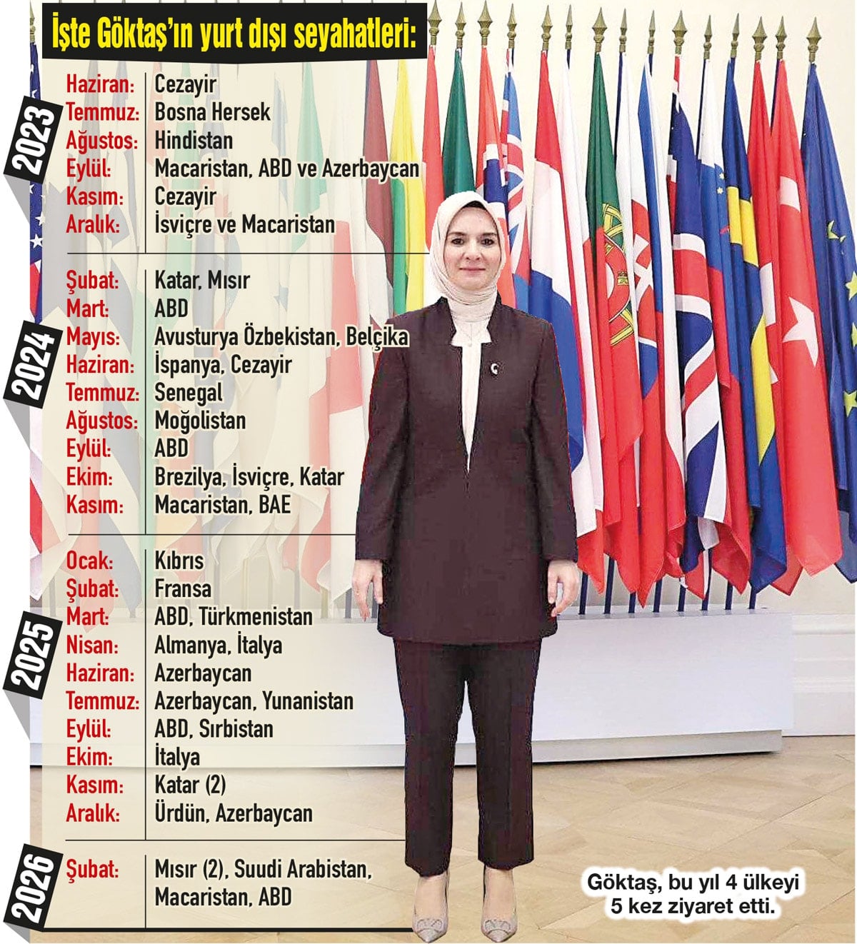 Göktaş bu yılın ilk 2.5 ayında ise iki kez Mısır’a, birer kez de Macaristan, ABD ve Suudi Arabistan’a gidip toplam 11 gün kaldı. Aile ve Sosyal Hizmetler Bakanlığı’nın faaliyet raporunda Göktaş’ın bu gezileri için “Ülkelerin aile ve sosyal hizmetler alanındaki politika ve uygulamalar ve iş birliğine açık alanlar somutlaştırılmıştır. Ziyaretler, Türkiye’nin aile, kadın, çocuk, engelli ve yaşlılara yönelik politika ve kalıcı etki üretmeye yönelik diplomasi anlayışını yansıtmaktadır” denildi.