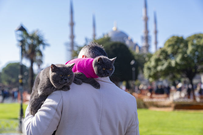 Hakan Emrah, İstanbul'un simge noktalarını gezerken omzunda taşıdığı kedilerinden dolayı yerli ve yabancı turistler tarafından sürekli durduruluyor.