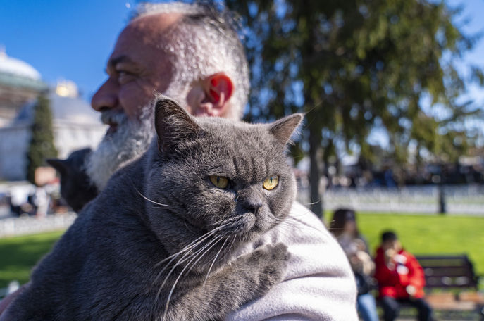 Fitness eğitmeni 49 yaşındaki Hakan Emrah, Kız Kulesi, Ayasofya, Sultanahmet ve Taksim Meydanı gibi İstanbul'un tarihi ve turistik yerlerini 'Reis' isimli kedisiyle yaklaşık 4 yıldır geziyor.