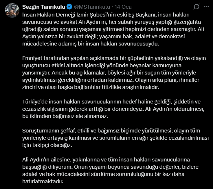 Soruşturmanın şeffaf, etkili ve bağımsız biçimde yürütülmesi; olayın tüm yönleriyle ortaya çıkarılması ve sorumluların en ağır şekilde cezalandırılması için takipçi olacağız. Ali Aydın’ın ailesine, yakınlarına ve tüm insan hakları savunucularına başsağlığı diliyorum. Onun yaşamı boyunca savunduğu değerler, bizlere adalet ve hak mücadelesini sürdürme sorumluluğunu bir kez daha hatırlatmaktadır."