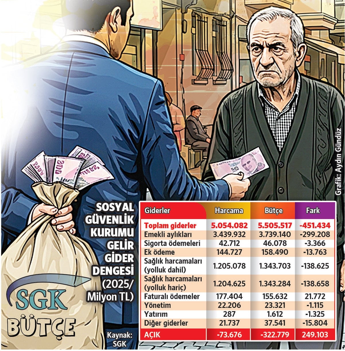 SGK’nın giderlerindeki kısıtlamayı, 20 bin liraya bir ay geçinmesi beklenen emekliden yana kullanması tepkilere neden oldu. Kurumun Aralık 2025 verilerini inceleyen Çalışma Ekonomisi Uzmanı Prof. Dr. Aziz Çelik, “2025’te emekliler için harcamayı planladıkları 451 milyar lirayı harcamamış” diyerek “SGK’yı adeta bir şirket gibi yönetmişler! Şirketin çıkarlarını her şeyini üstünde tutmuşlar” ifadelerini kullandı.