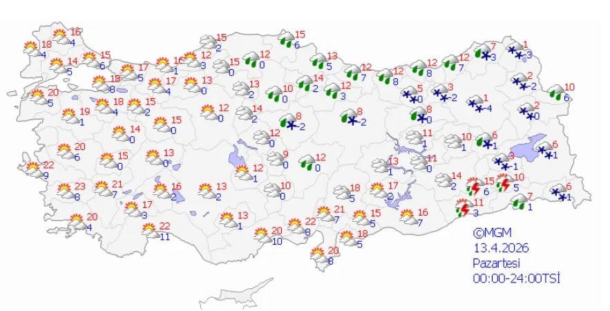 Meteoroloji Genel Müdürlüğü, sıcaklıkların yükselmesinden önce olası risklere karşı 38 il için sarı kodlu uyarı yayımladı. Bugün Marmara, Ege ve Batı Akdeniz dışında kalan bölgelerin tamamında yağış beklenirken; Hatay, Erzurum, Şırnak ve Hakkari gibi illerde ise yağışların yer yer kuvvetli kar ve sağanak şeklinde görüleceği tahmin ediliyor.
