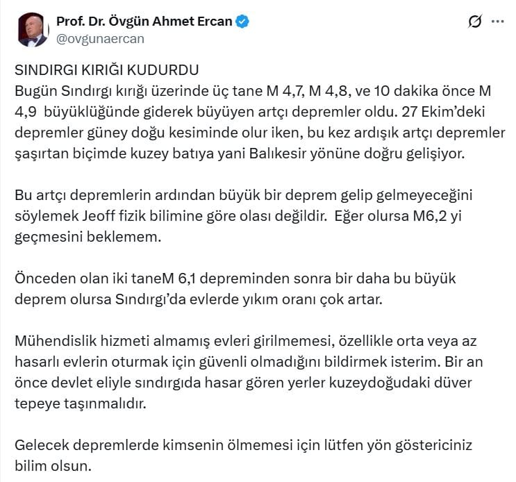 Sındırgı kırığı üzerinde 4.7, 4.8 ve 4.9 büyüklüğünde üç artçı depremin olduğunu aktaran Jeofizik Yüksek Mühendisi Prof. Dr. Övgün Ahmet Ercan, kritik bir açıklama yaptı.