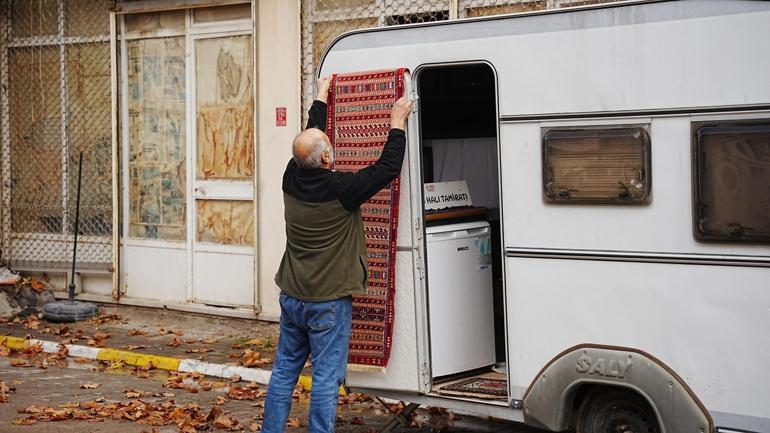 Sındırgı’da artçılar nedeniyle dükkanında çalışamayan halı ustası, işini karavana taşıdı