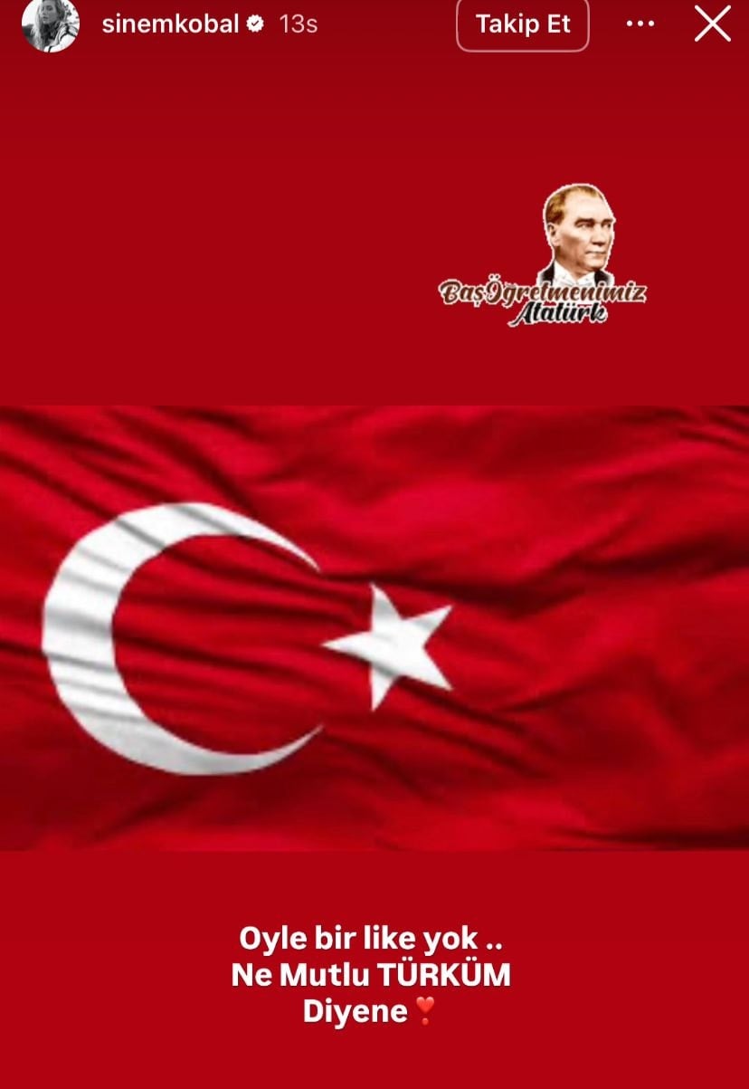 Öte yandan oyuncu Sinem Kobal, Belçim Bilgin'in paylaşımını beğenip geri çektiği iddiasıyla gündeme gelince "Öyle bir beğeni yok, ne mutlu Türküm diyene" paylaşımını yaptı.