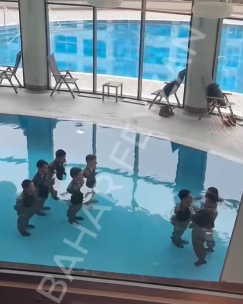 BOTLARLA SUYA GİRDİLEROlayın dikkat çeken bir diğer boyutu ise hijyen ve kuralların ihlali oldu. Askerlerin, dışarıda giydikleri askeri postalları ve üniformalarıyla havuza girdikleri, suyun içinde dakikalarca tören yaptıkları belirtildi.