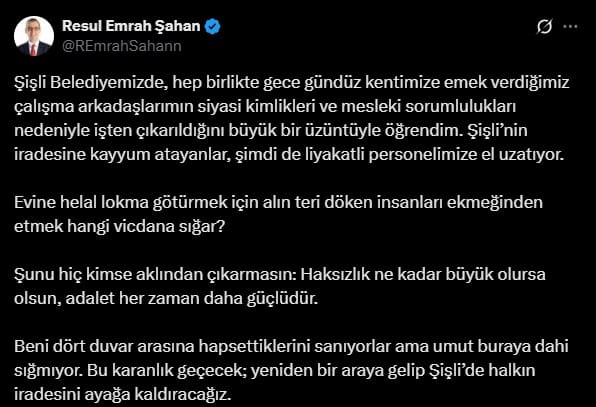 TUTUKLU BAŞKAN ŞAHAN'DAN CEZAEVİNDEN 'VİCDAN' SORUSUYaklaşık 8 aydır Silivri'deki Marmara Cezaevi'nde tutuklu bulunan seçilmiş Şişli Belediye Başkanı Resul Emrah Şahan da işten çıkarmalara sosyal medya hesabı üzerinden tepki gösterdi. Şahan, paylaşımında şu ifadeleri kullandı: