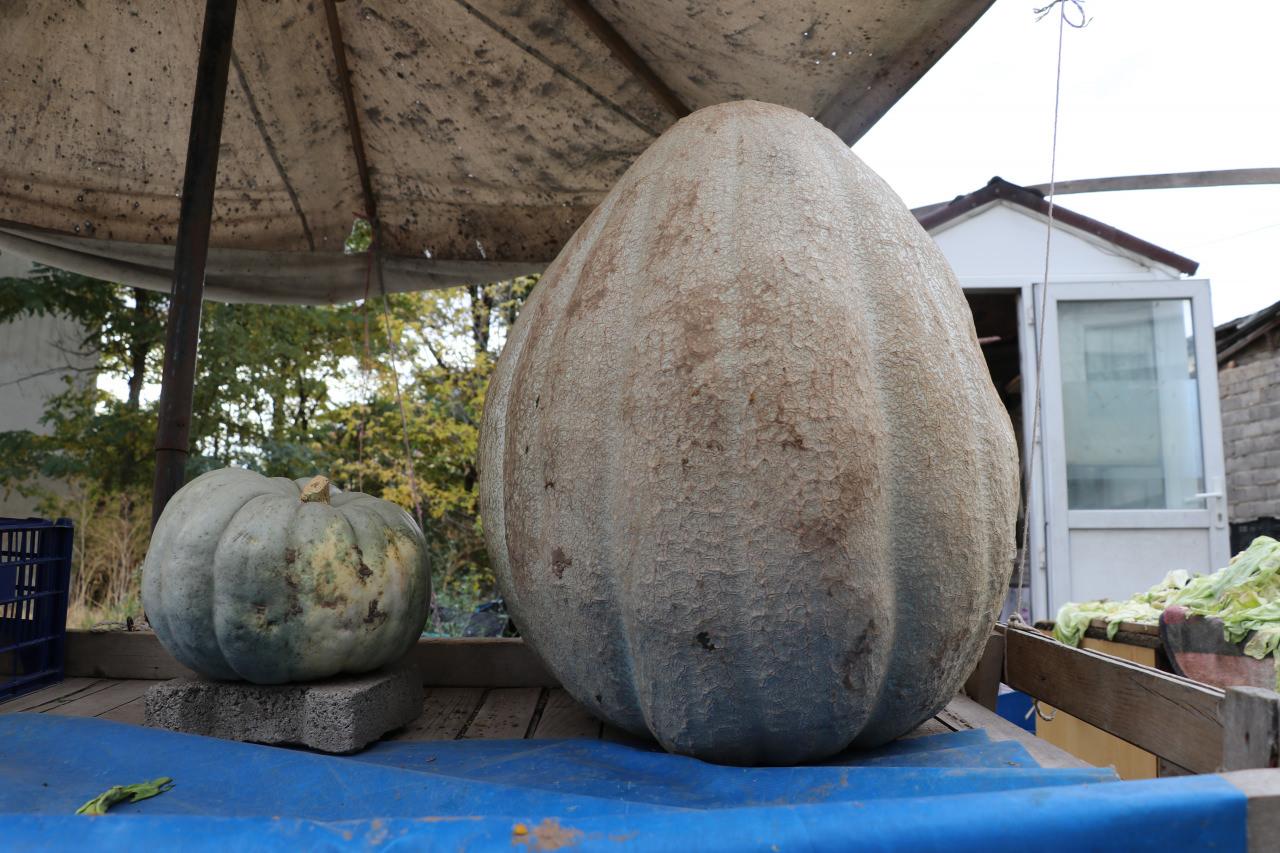 Tezgahta satış için sergilenen dev kabak, çevredekilerin de ilgisini çekti.