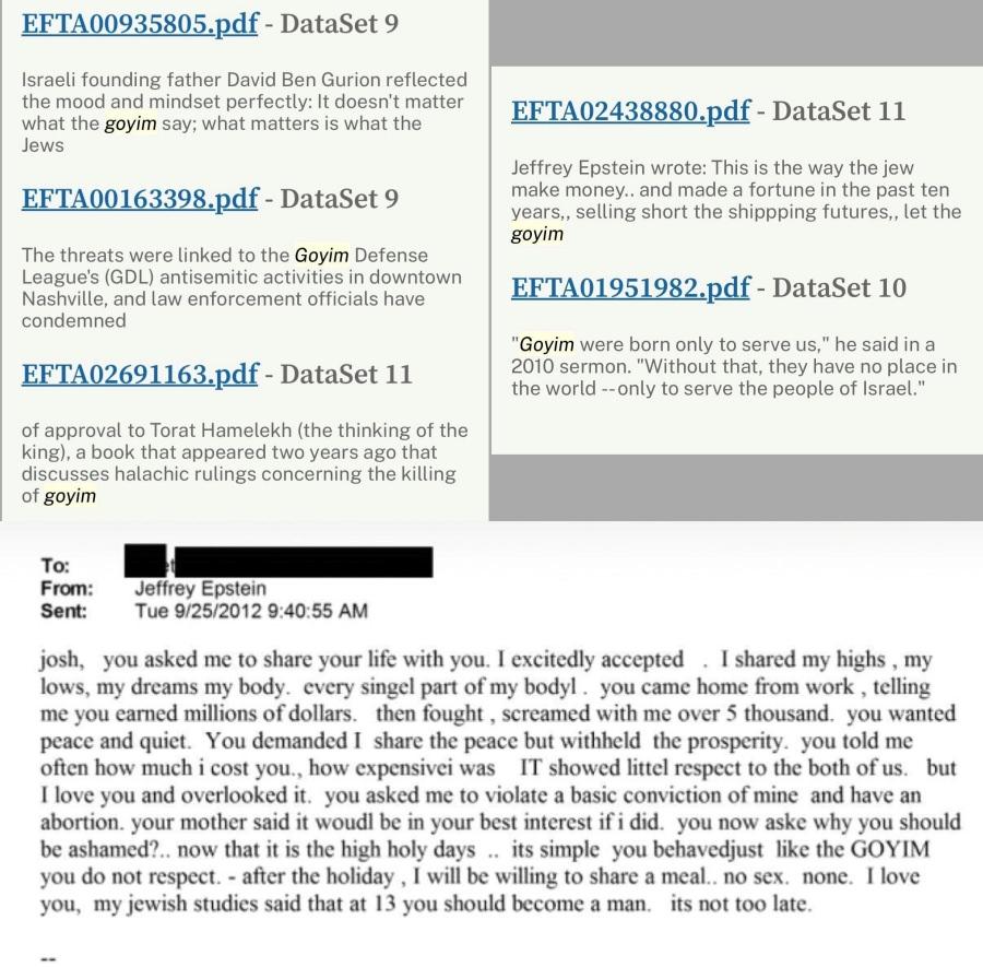 Milyarder sapık Jeffrey Epstein’e ait deşifre edilen 3 milyonu aşkın yazışma ile 2 bin video ve 180 bin görsel arasındaki rezillikler tek tek açığa çıkıyor. Çocuklara ve savunmasız kadınlara yönelik dehşet verici sapkınlıkları ifşa etmekle kalmayan belgeler, Epstein’in Yahudi kimliğiyle gerçekleştirdiği alçaklıkları gözler önüne seriyor. Kaynaklardan elde edilen bilgilere göre Epstein, Yahudi olmayanları ifade eden “goyim” ifadesini hem finansal tetikçilik hem de aşağılama aracı olarak kullanıyor.