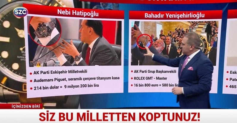 "- İYİ Parti'den AKP'ye geçen Nebi Hatipoğlu meclisteki toplantısına gidelim. Kolundaki saate bakalım. Markası Audemars Piguet, seramik çerçeve titanyum kasa. Değeri nedir 214 Bin dolar. Bugünün kuru ile 9 Milyon 200 Bin lira. Servet düşmanı değiliz. Nebi Bey önemli iş insanlarından biri."