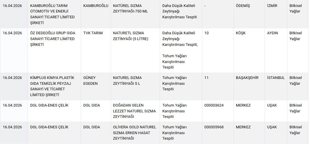 Tarım ve Orman Bakanlığı, halk sağlığını tehlikeye atan ve tüketiciyi yanıltan firmaları ifşa etmeye devam ediyor. 16 Nisan 2026 tarihli güncel listede, özellikle zeytinyağı sektöründeki ciddi usulsüzlükler dikkat çekiyor. Yapılan denetimlerde, "Natürel Sızma" adı altında satılan ürünlerin içine tohum yağları ve düşük kaliteli yağlar karıştırıldığı tespit edildi.
