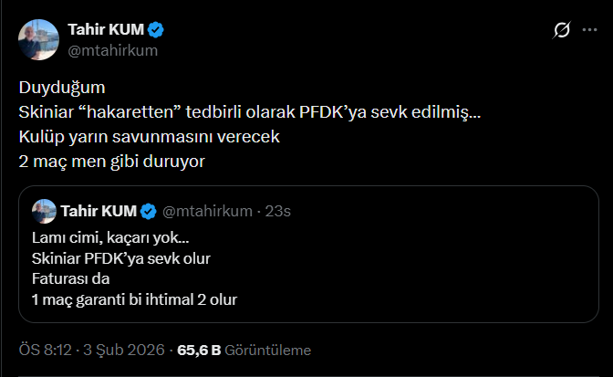 TFF’YE ŞİKAYET ETTİLERKocaelispor Başkanı Recep Durul, Milan Skriniar’ın hareketi ile ilgili olarak “Kulüp olarak Milan Skriniar’ın yaptığı çirkin hareketin TFF tarafından cezalandırılmasını, sözleşmesinin feshedilmesini ve hatta ülkeden deport edilmesini istiyoruz. Bunun için gereken başvuruyu da yapacağız” dedi.