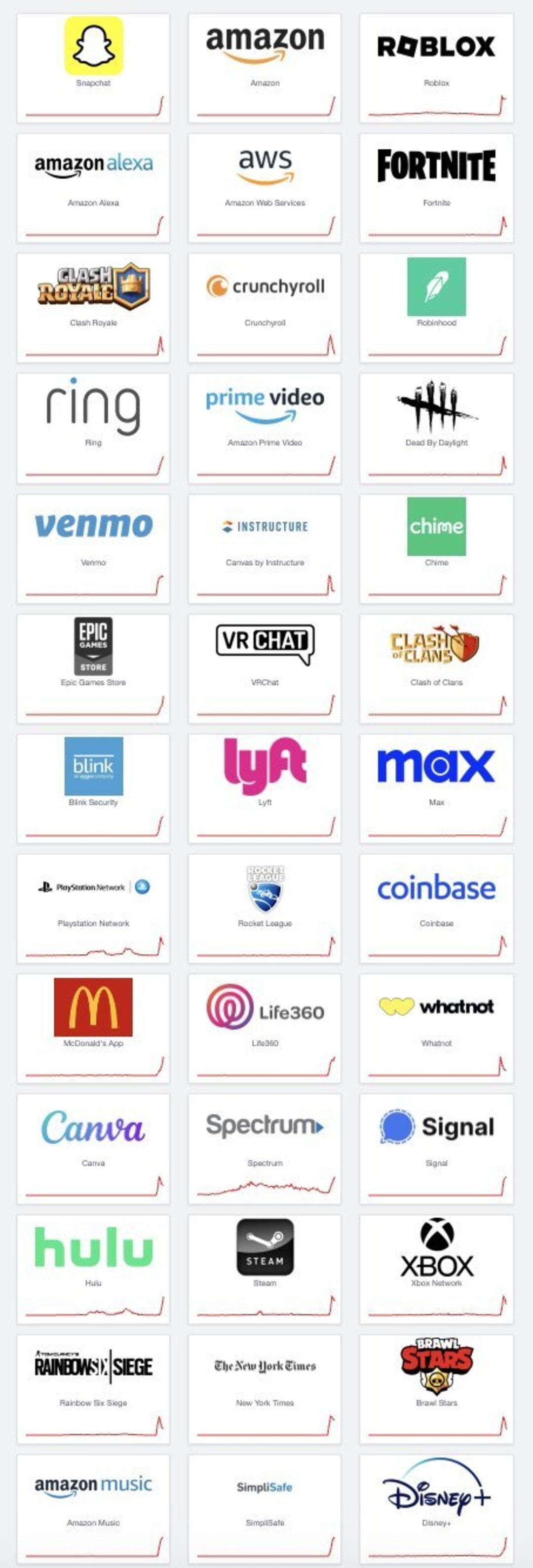 Snapchat, Amazon Web Services, Epic Games Store, Zoom, Fortnite, Udemy, Ring, Clash Royale, PlayStation Network, Life360, Signal, Canva