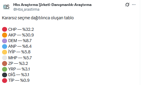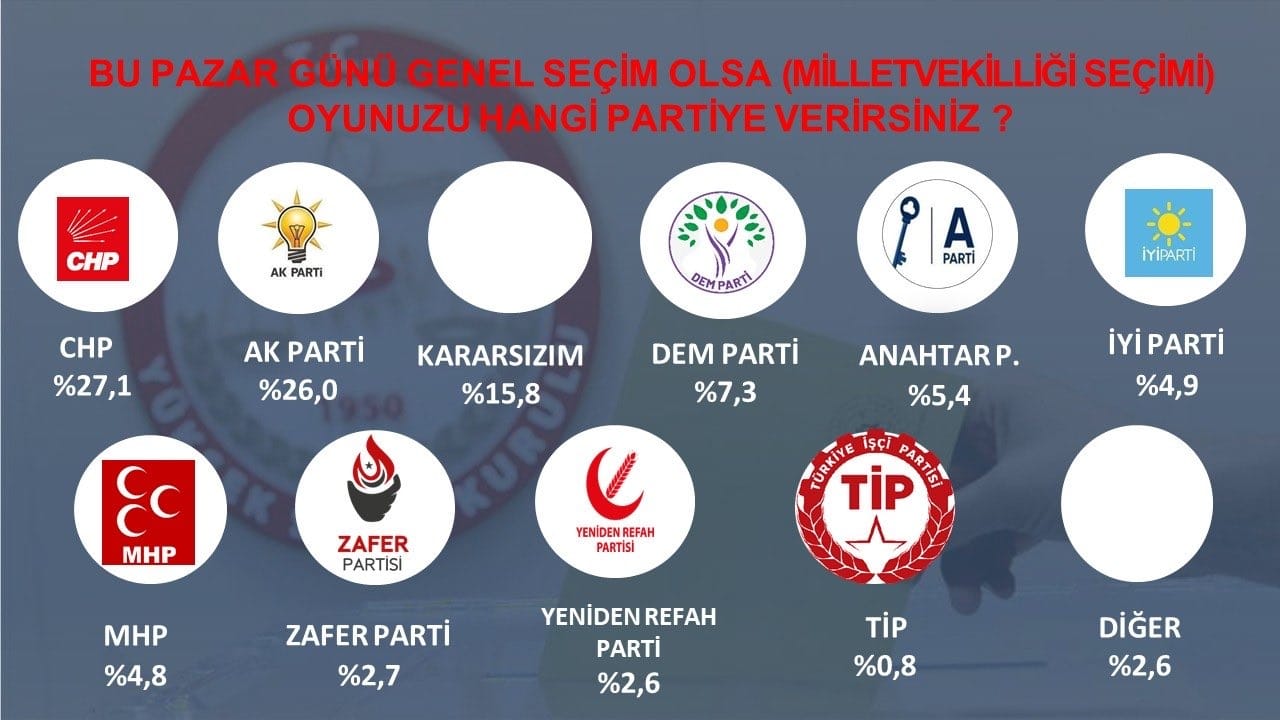 Kararsız seçmenlerin dağıtılmasından sonraki sonuçlarİYİ Parti’nin 2023’teki yüzde 9.7’lik oy oranından yüzde 5.8’e gerilemesi, MHP’nin ise yüzde 10.1’den yüzde 5.7’ye düşmesi dikkat çekti. DEM Parti’nin oy oranı büyük ölçüde sabit kalırken, Zafer ve Yeniden Refah partilerinin sınırlı da olsa yükseliş gösterdiği görüldü.