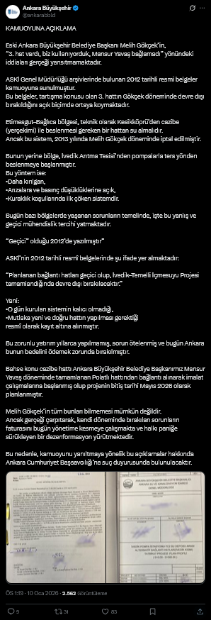 “ASKİ Genel Müdürlüğü arşivlerinde bulunan 2012 tarihli resmi belgeler kamuoyuna sunulmuştur. Bu belgeler, tartışma konusu olan 3. hattın Gökçek döneminde devre dışı bırakıldığını açık biçimde ortaya koymaktadır.”